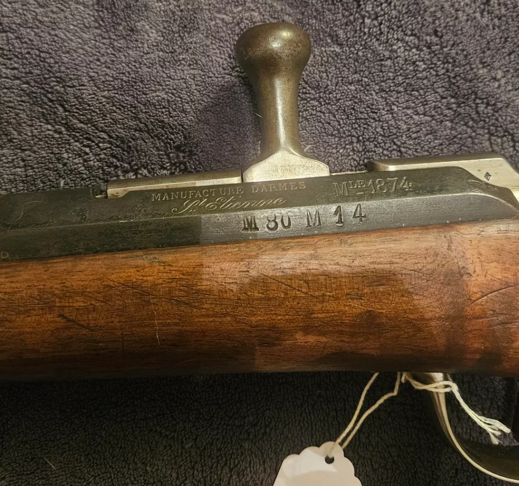 La baïonnette M-1874, a été utilisée par les territoriaux au début de la première Guerre Mondiale avec les 146 000 fusils du système Gras re-canonnés avec des tubes de fusil Lebel pour passer au calibre 8 mm, à partir de novembre 1914 (et jusqu’en octobre 1915). Ces armes modifiées étaient bien sûr munies d’un porte baïonnette adapté. Certains de ces fusils sont restés stockés dans les arsenaux français jusqu’à la seconde Guerre Mondiale, et vous pouvez même en trouver marqués N pour une utilisation avec des balles N.