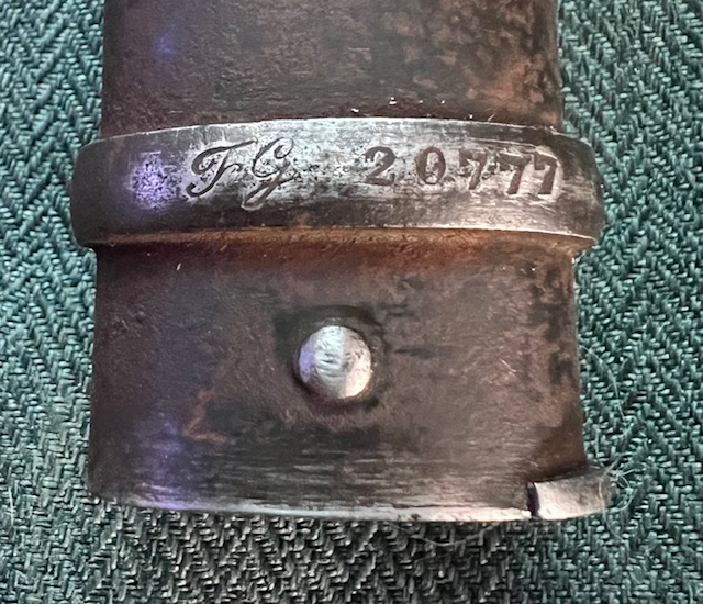 Les lettres U ou V suivi du matricule, très rarement inscrites sur le fourreau, indiquent que celui-ci est d’importation. En effet, après la fermeture de la manufacture de Mutzig, celles de Tulle, St Étienne et Châtellerault ne pouvant satisfaire à la demande, la firme Cahen-Lyon fut mandaté par l’état pour importer ces armes de l’étranger. Ainsi, la firme Cahen-Lyon s’est fournie en Angleterre, Belgique, Allemagne, Autriche…, (merci à Michel pour l’info).