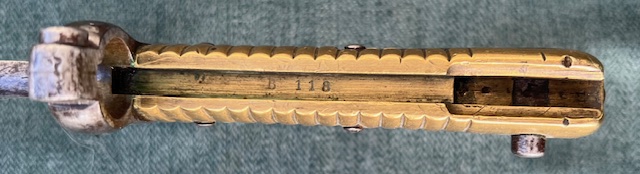 La poignée est constituée d’un pommeau en laiton massif qui intègre un mécanisme de verrouillage avec bouton-poussoir avec lame à ressort en acier fixée par un rivet. Les plaquettes en noyer, dont une intègre également une partie de la lame ressort sont maintenues à la soie par deux rivets sur rondelles.