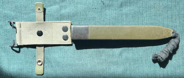 Le fourreau est constitué d’un corps en plastique moulé noir, sans trou à l’extrémité permettant à l’eau de s’évacuer, ni orifice pour le passage du lacet de maintien. La cornière à l’arrière servant de point d’appui à la suspension attelée est fixée à la chape par points de soudure électrique. La suspension en coton tissé, sans double crochet est maintenue sur la cornière à l’arrière par deux gros rivets plats. La sangle utilisée pour le maintien de la baïonnette qui se verrouille grâce à un bouton pression est fixée à l’aide d’un gros rivet plat sur la suspension.