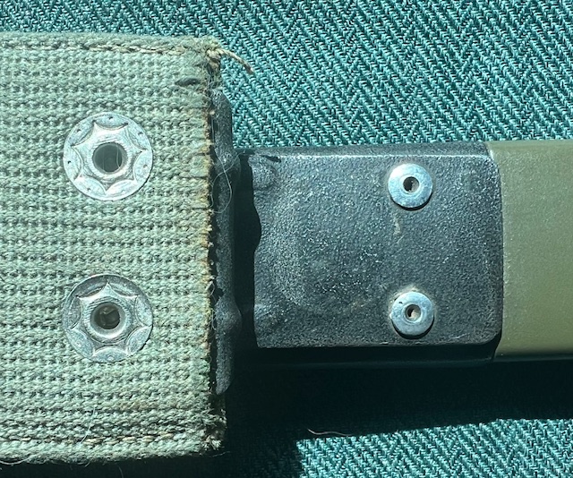 Le porte-fourreau attelé interchangeable en cuir, fixé sur la cuvette par quatre rivets en laiton ou en acier peut être de couleur jaune-kaki, ou vert. Il est pourvu du double crochet de type US afin de s’adapter au ceinturon en toile style US. Il est possible, si il n’est pas effacé, d’apercevoir le code fabricant, et quelques fois l’année de fabrication sur la sangle de fermeture.