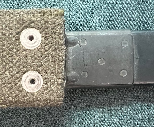 Le porte-fourreau utilisé avec ce modèle est de type P-1937, en toile de couleur brune, à double boucle et passant fixe.