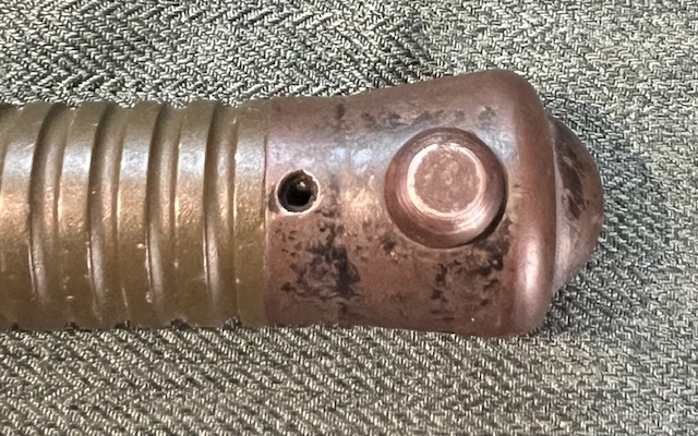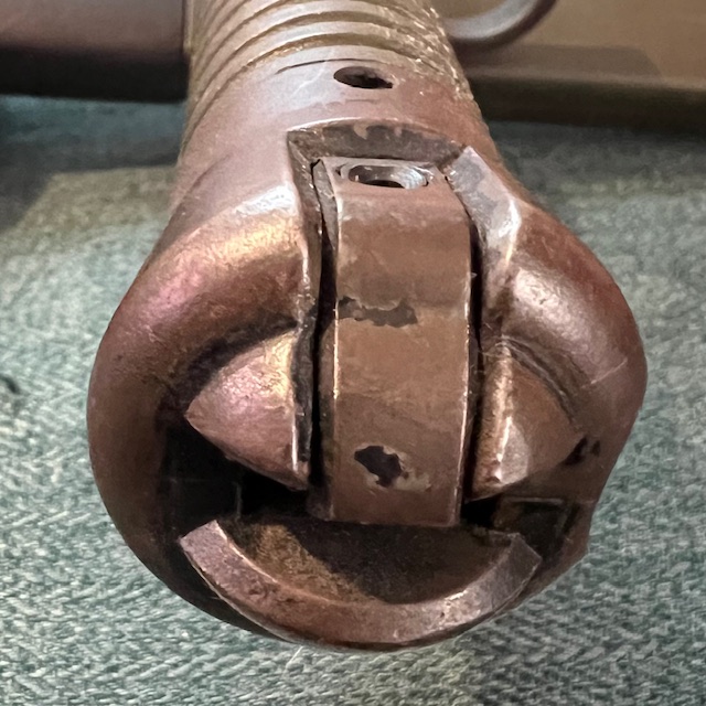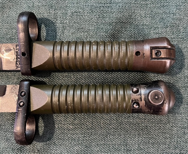 Pour la seconde la plus rare, le pommeau et la croisière sont fixés par deux goupilles creuses. Le pommeau ne comporte plus les quatre petits dégagement destinés à faciliter la mise en place correcte des rivets bombés, le coût de fabrication de la baïonnette en est ainsi un peu réduit. On peut remarquer le jeu plus important au niveau de l’ajustage du mécanisme mobile du verrouillage.