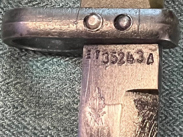 Quelque fois, il est possible de trouver accroché à la bague, cette étiquette d’inventaire espagnole. Elle comprenait le numéro de nomenclature OTAN du modèle : 1095-33-000-0293, la description: Cuchillo-Bayoneta (couteau-baïonnette), et le n° de série propre à la baïonnette ET 35243 A.