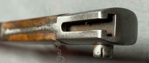 La poignée de finition soignée, possède un pommeau oblique qui comporte une rainure en forme de T, les plaquettes de forme droite sont maintenues entre elles par deux rivets sur rondelles. La croisière est munie d’une bague fendue qui peut être correctement ajustée au diamètre extérieur du canon grâce à une vis de réglage.