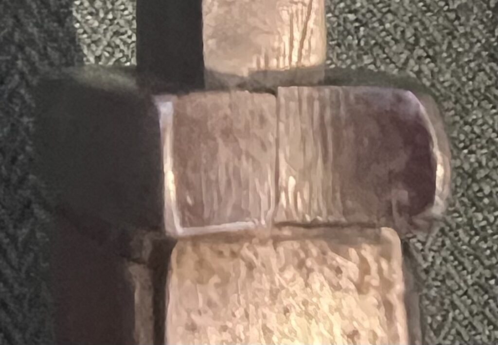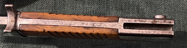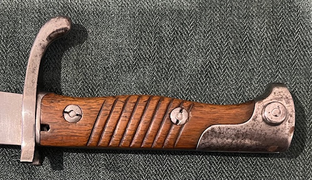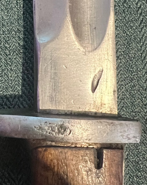Près de la croisière à gauche, un bouton poussoir quadrillé à rappel par ressort permet de verrouiller la baïonnette au fourreau. Ce bouton n’est pas indispensable au maintien de la baïonnette, il remplace le clip en tôle d’acier ressort du M-1896 qui permettait de solidariser la baïonnette à son fourreau pour l’escrime (entrainement), ce n’est que mon avis personnel.