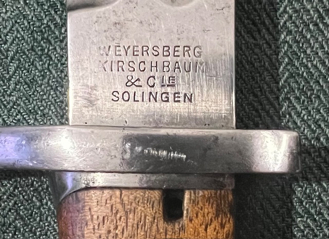 Les premières baïonnettes fournies, lors de l’adoption de ce nouveau fusil possédaient toutes un crochet qui sera définitivement supprimé du mode de fabrication vers 1900. Initialement, les baïonnettes ont été commandées à trois fournisseurs étrangers : la Oesterreichische Waffenfabriks Gesellschaft à Steyr (OEWG) jusqu’en 1900, Alexander Coppel à Solingen (AC et une balance) 1900-1905 et la firme Weyersberg & Kirschbaum à Solingen (WK & C) 1900-1905.