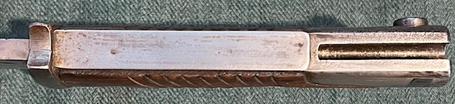 La poignée comporte les plaquettes d’origine maintenues entre elles par boulons à tête ronde et écrous fendus. Le bouton poussoir de verrouillage d’origine rond a été modifié de manière à le rendre fendu.