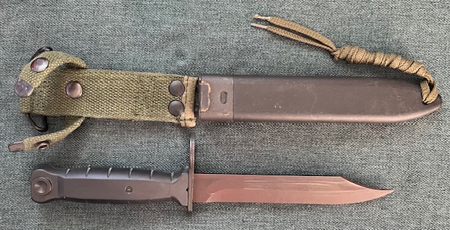 Le fourreau utilisé pour ces baïonnettes est un modèle M8 A1 de fabrication US ou italienne, dépourvu du double crochet de suspension au ceinturon, avec ou sans renfort à l’extrémité. Voir histoire des (Fourreaux US M8/M8A1).