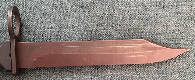 La lame a été raccourcie et amincie de façon très grossière afin de ressembler à la lame de la baïonnette de la carabine M1.