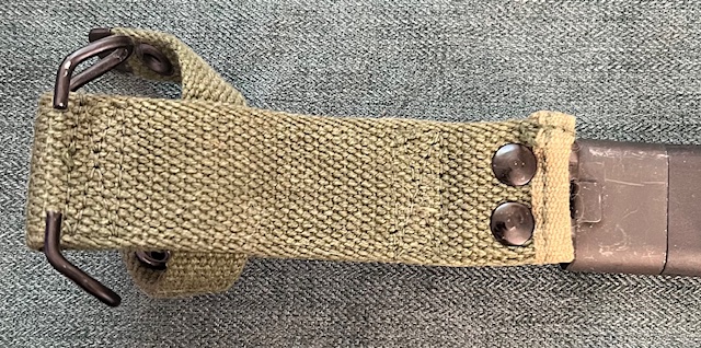 Le porte-fourreau est identique à celui utilisé pour le port du fourreau de la baïonnette 6×3. Il est semblable au modèle bulgare, seule la forme des rivets (creuse) de la partie métallique à l’arrière les différencie.