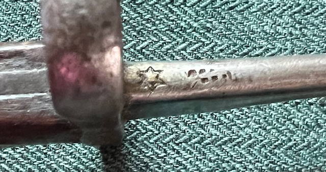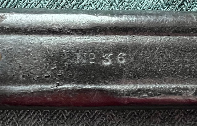 Elle comporte d’un côté la marque du fabricant (numéro 11 dans l’ovale) en dessous l’année de fabrication (55, 56, 57). De l’autre côté, un timbre d’acceptation militaire à peine visible et un numéro de série répété sur le fourreau.