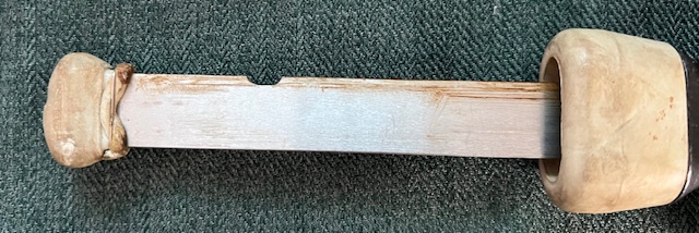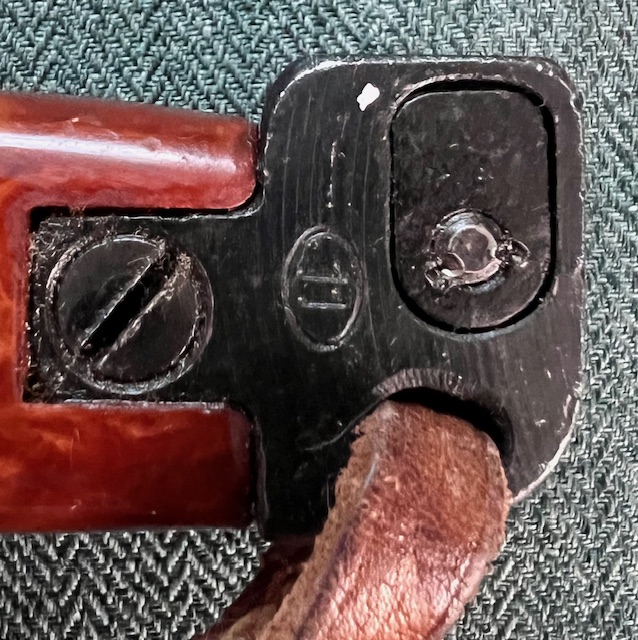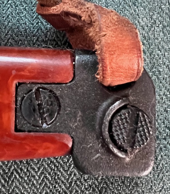 La lanière de maintien en cuir ne comporte qu’une partie métallique, la boucle près du pommeau est fermée par points de couture.