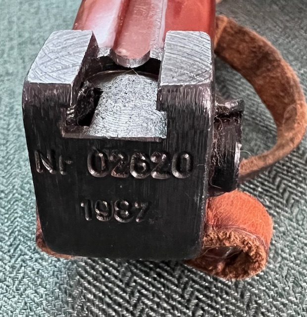 La poignée de type 6×4 est de constitution spécifique à ce modèle car elle intègre la lame. L’arrière des pommeaux des exemplaires fabriqués à Radom (Usine 11) porte un n° de série, deux lettres (Nr) suivies par cinq chiffres, datés de 1985 à 1989.