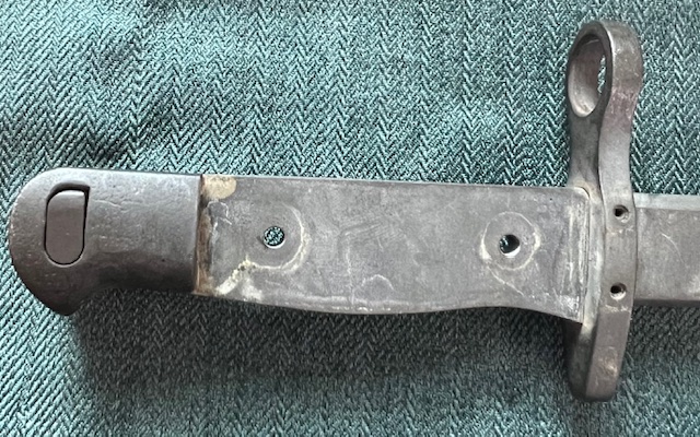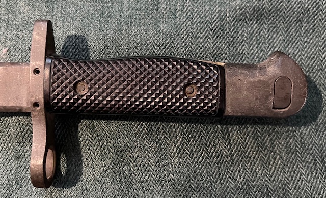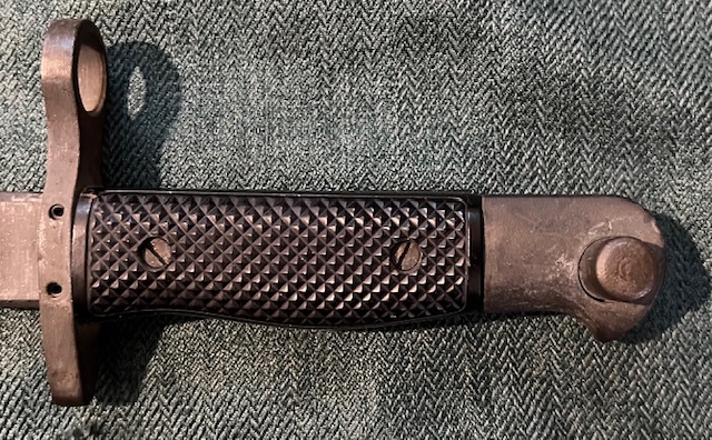 La lame de finition phosphatée avec un profil légèrement plus affiné à son extrémité que le M-1917 de première génération, est dépourvue de tous marquages. Elle est munie d’une gouttière sur chaque face et d’un dos arrondi, son tranchant est légèrement affûté sur toute la longueur, sa résistance à la torsion est excellente.