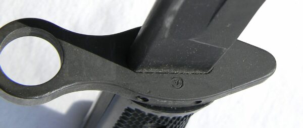 La poignée possède un pommeau droit qui comporte une rainure en forme de T, petite spécificité, le bouton de verrouillage est très proéminent afin de faciliter son utilisation avec des gants. Les plaquettes en plastique finement quadrillées sont maintenues entres elles par vis à tête ronde et écrous intégrés à la plaquette.