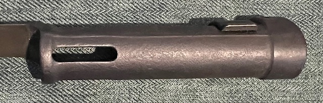 La poignée tubulaire lors de la mise en place sur l’arme intègre l’extrémité du canon, quatre orifices permettent aux gaz de s’échapper en évitant les flammes lors d’un tir. Son verrouillage est assuré par une pièce en acier mobile à rappel par ressort qui la traverse.