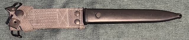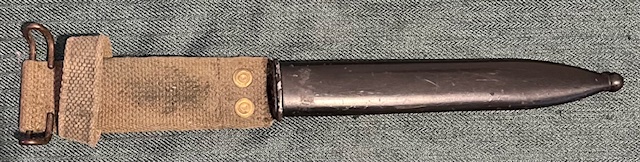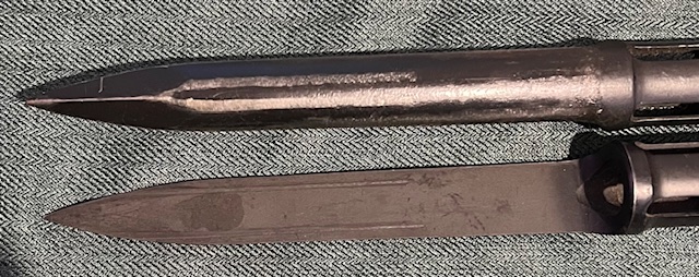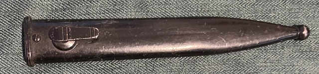 Fourreau métallique de fabrication belge recouvert d’une peinture noire, peut-être utilisé par les Pays-Bas avec les premières baïonnettes livrées.