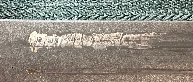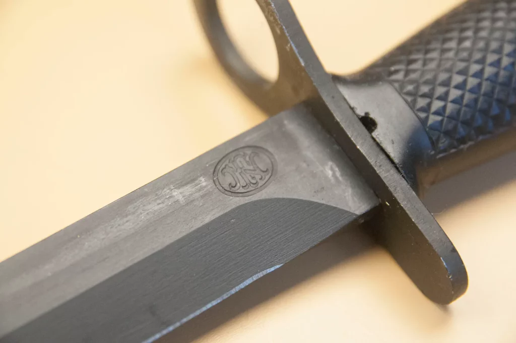 La lame phosphatée marquée à gauche (FN à l’intérieur d’un cercle) est de type US M4. Les baïonnettes utilisées par l’armée sont toutes dotées d’un n° de série à droite. Dans l’armée belge, le faite de perdre une baïonnette numérotée était aussi grave que de perdre un pistolet, une radio ou un autre objet militaire numéroté.