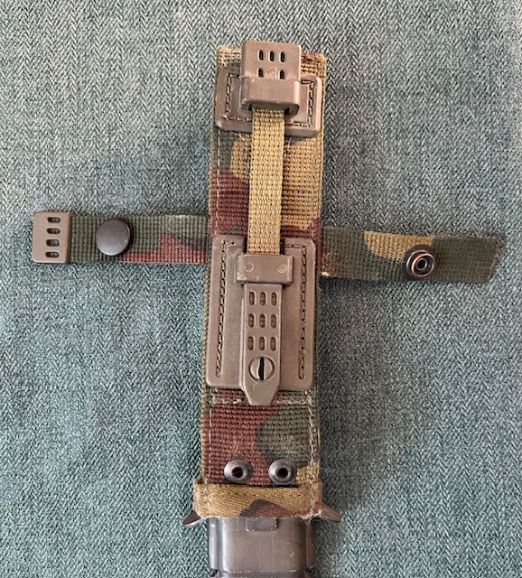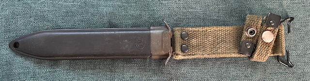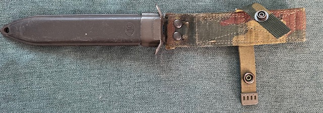 Le fourreau des premiers modèles est de type US M8 A1, pourvu d’un double crochet de suspension est une copie du modèle US M8 A1 allemand Eickhorn conçu dans les années 50. Son corps est constitué de plastique moulé de couleur noire, l’extrémité est dépourvue de renfort métallique. Le trou destiné à évacuer l’eau débouche directement sur celui utilisé pour le passage du lacet de maintien. La chape en acier phosphatée, est maintenue sur le corps par sertissage sur les côtés. A l’arrière de cette chape, une cornière en forme de L sert d’appui à la suspension en coton tissé (webbing), qui est maintenue par deux rivets emboutis. La sangle utilisée pour le maintien de la baïonnette est fixée à l’aide d’un rivet sur la suspension, elle se verrouille grâce à un bouton pression.