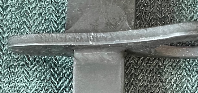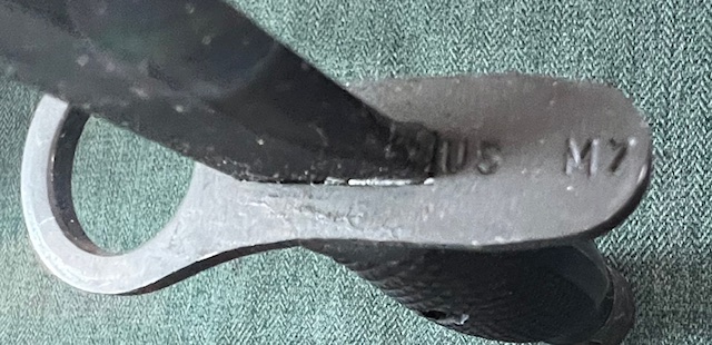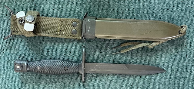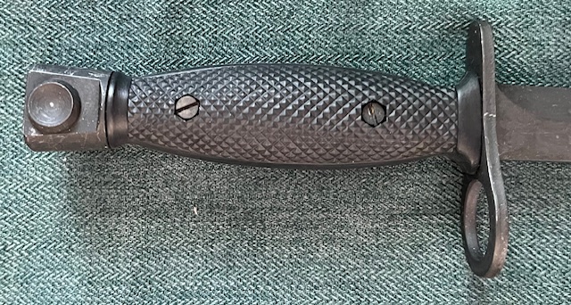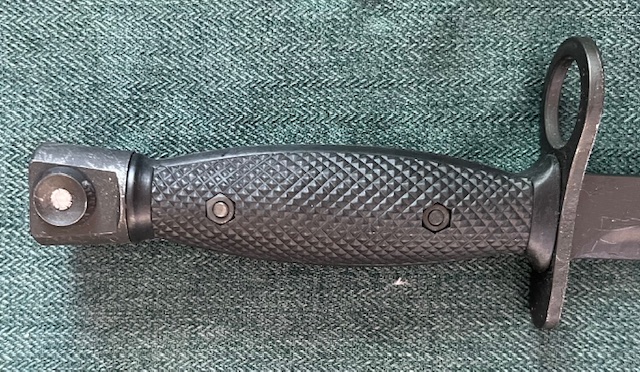 Cette baïonnette munie de plaquettes spécifiques est constituée de nombreux élément du modèle M7, seul le pommeau est différent. La croisière est maintenue à la soie par deux discrètes soudures, et le pommeau par une goupille.