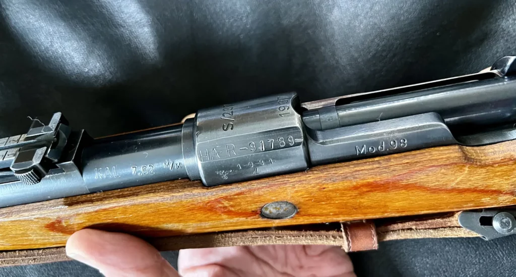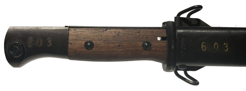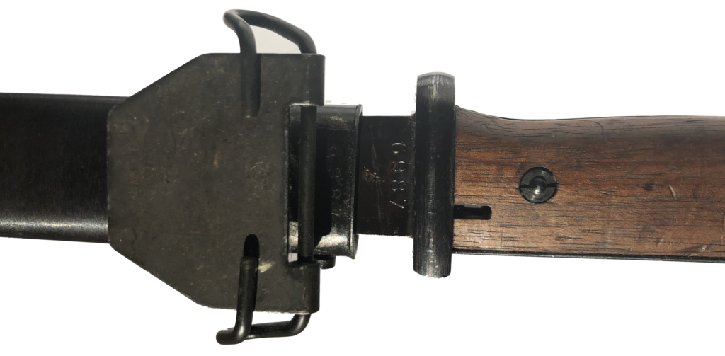 Pour information, je ne possède pas cette variante. En temps que collectionneur, j’ai constaté que certains vendeurs peu scrupuleux, ont la fâcheuse tendance à loger des baïonnettes 1884-98 orphelines, dans des fourreaux norvégiens modifiés OTAN. Pour une bonne concordance historique, la baïonnette et le fourreau doivent tous deux comporter le même numéro qui lui même correspond au nouveau matricule de l’arme.