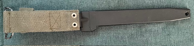 Le fourreau de première génération, pourvu du double crochet de suspension au ceinturon est du même type que celui utilisé avec la baïonnette allemande G3. Il est constitué d’un corps de forme angulaire en plastique moulé noir, le trou destiné à évacuer l’eau débouche directement sur celui utilisé pour le passage du lacet de maintien. La chape en tôle d’acier, est maintenue au corps par emboutissage. Un dispositif de verrouillage extérieur (ressort à lame muni d’un crochet plié) sur le côté, permet de bloquer correctement la baïonnette dans le fourreau. A l’arrière de la chape, une cornière en forme de L sert d’appui à la suspension en coton tissé (webbing), qui est maintenue par deux rivets emboutis. La sangle utilisée pour le maintien de la baïonnette est fixée à l’aide d’un rivet sur la suspension de type OTAN, elle se verrouille grâce à un bouton pression.