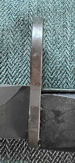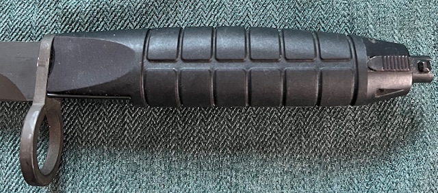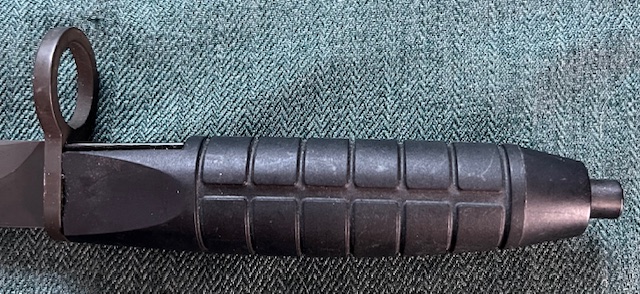 La croisière ainsi que la bague de ce modèle sont spécifiques au niveau de l’épaisseur. La poignée près de la croisière est munie de deux petites encoches destinées à bloquer le crochet du ressort plat situé à l’arrière du fourreau d’origine allemand.