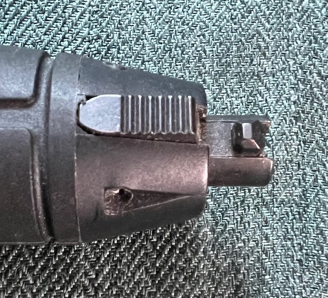 Le pommeau en plastique fait partie de la poignée, par rapport à la bague, (vue arrière) le crochet intégré au tenon de verrouillage se situe à environ 3 heures.