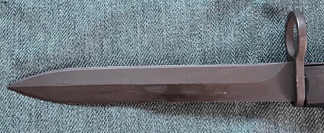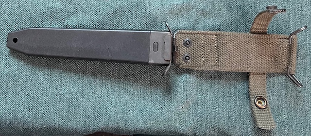 Le fourreau pourvu du double crochet de type US, est constitué d’un corps de forme angulaire en plastique moulé noir, le trou destiné à évacuer l’eau débouche directement sur celui utilisé pour le passage du lacet de maintien. La chape en tôle d’acier, est maintenue au corps par emboutissage. Un dispositif de verrouillage extérieur (ressort à lame muni d’un crochet plié) à l’arrière, permet de bloquer correctement la baïonnette dans le fourreau. A l’arrière de la chape, une cornière en forme de L sert d’appui à la suspension en coton tissé (webbing), qui est maintenue par deux rivets emboutis. La sangle utilisée pour le maintien de la baïonnette est fixée à l’aide d’un rivet sur la suspension, elle se verrouille grâce à un bouton pression.
