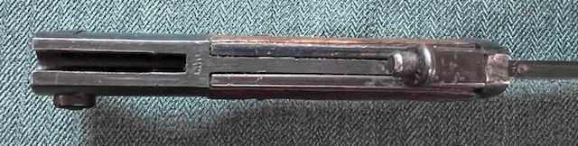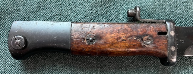 La poignée : la partie dorsale du garde-flamme a été supprimée pour permettre le montage de l’équerre portant le téton de fixation au fusil Garand. Les deux parties du part-flamme qui coiffaient les plaquettes ont été maintenues car sans cela celles-ci ne seraient plus jointive à la soie. Les plaquettes de préhension d’origine peuvent être en bois ou en Bakélite.