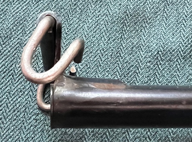 Le fourreau d’origine a été modifié afin de recevoir le double crochet de fixation au ceinturon de type US, la vis de maintien de la cuvette/ressort est toujours présente.